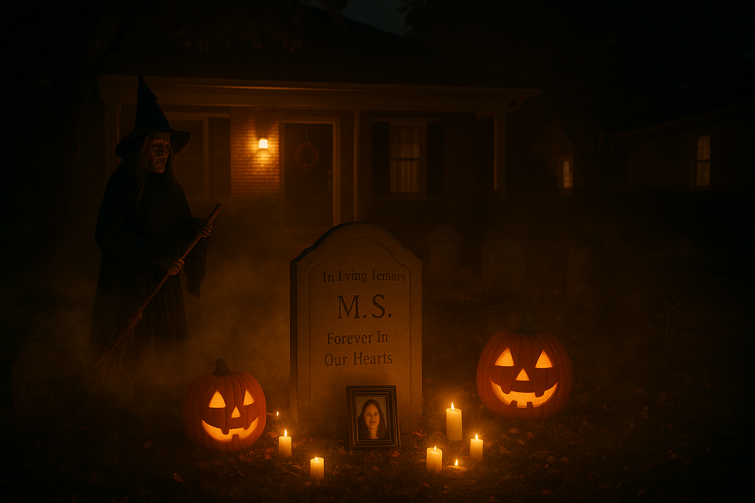 By Halloween night, the yard wasn’t scary anymore — it was peaceful. The flickering candles, the quiet hum of the fog machine, the scent of flowers… it felt like Megan was there.